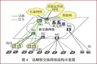 隨著PSTN用戶逐步轉(zhuǎn)變?yōu)檐浗粨Q網(wǎng)絡(luò)用戶,未來以軟交換網(wǎng)絡(luò)為核心、PSTN端局作為接入的網(wǎng)絡(luò)結(jié)構(gòu)將逐步形成。如圖4所示,軟交換網(wǎng)絡(luò)將覆蓋包括PSTN用戶在內(nèi)的各種類型的用戶終端,具有SSP功能,提供智能網(wǎng)業(yè)務(wù);具備大容量關(guān)口局功能,實(shí)現(xiàn)與其他運(yùn)營(yíng)商網(wǎng)絡(luò)的互通。