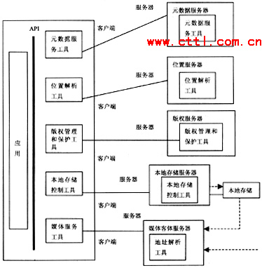 在DAVIC1.5AnytimeAnywhere文件中所規(guī)定的模型如圖2所示。在該圖中沒有描述任何與網(wǎng)絡相關的內(nèi)容。僅規(guī)定出在客戶端設備和服務器端設備中應當包含的功能模塊。即:元數(shù)據(jù)服務、位置解析、版權管理和保護、本地存儲控制、媒體服務。其基本思想為,在服務器端提供的所有功能。在客戶端設備中應包含有相關的軟件工具。在業(yè)務的具體實施過程中,客戶端首先向服務器端請求幫助查找其感興趣的媒體內(nèi)容,由元數(shù)據(jù)服務器處理并返回相關信息。通過位置解析服務器來確定客戶端所選擇的媒體內(nèi)容所在的位置;經(jīng)過媒體管理和保護服務器的認可:由本地存儲服務器向用戶提供媒體信息同時允許客戶端對媒體信息進行控制。