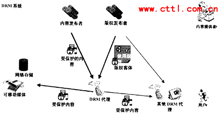 如圖4所示,DRM系統(tǒng)主要負責將內(nèi)容發(fā)布者發(fā)布的信息與版權發(fā)布者發(fā)布的信息組合起來將內(nèi)容變?yōu)槭鼙Wo的內(nèi)容,由版權客體提供使用規(guī)則,用戶在使用內(nèi)容時需要首先從DRM代理處根據(jù)使用規(guī)則獲得使用受保護內(nèi)容的密鑰,然后使用所獲得的密鑰對受保護的內(nèi)容進行解碼并使用。