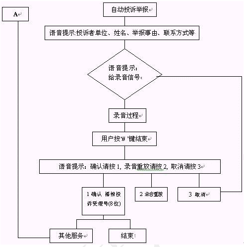 群眾通過自動臺按照語音提示進(jìn)行投訴、舉報選擇錄音。自動投訴舉報錄音流程如下: