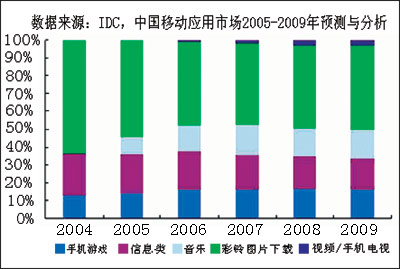 與此同時,中國移動增值電信業(yè)務(wù)占移動運營商的業(yè)務(wù)收入比重不斷增加,根據(jù)IDC統(tǒng)計,2004年中國移動增值服務(wù)市場的個人應(yīng)用市場達到340億元人民幣,該市場在2009年將達到880億元人民幣,其2004年~2009年復合年平均增長率為15.3%。