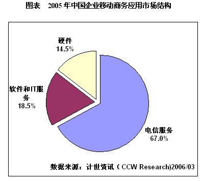 目前,我國移動商務(wù)市場仍處于萌芽期,根據(jù)計世資訊(CCW Research)《2005-2006中國移動商務(wù)應(yīng)用發(fā)展趨勢研究報告》數(shù)據(jù),2005年中國企業(yè)移動商務(wù)應(yīng)用市場規(guī)模為112.5億元,其中硬件投資為16.3億元,軟件與IT服務(wù)投資為20.8億元,電信服務(wù)投資達(dá)到75.4億元,占有整體市場的67.0%。