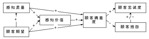 該模型是由六個(gè)隱變量組成的因果模型,其中顧客滿意度是最終要求的目標(biāo)變量,感知質(zhì)量、感知價(jià)值和顧客期望是因變量,而顧客忠誠(chéng)度和顧客抱怨則是顧客滿意與否的結(jié)果變量。