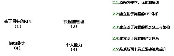 因此,要有效實(shí)施“流程型”管理,必須在我們?nèi)粘9芾淼膬?nèi)容、KPI體系、組織架構(gòu)、績效評(píng)價(jià)體系和組織發(fā)展的驅(qū)動(dòng)力五個(gè)方法實(shí)施同步的轉(zhuǎn)變,才能有效建立流程文化,保證整個(gè)組織對(duì)流程的理解和重視,提高組織的執(zhí)行能力,通過“組織能力”保證組織目標(biāo)的實(shí)現(xiàn),而非依賴個(gè)體能力。