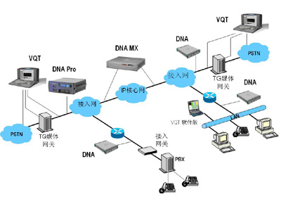 以上兩種測(cè)試方法也可以結(jié)合使用,在進(jìn)行端到端VQT測(cè)試時(shí),在NGN網(wǎng)絡(luò)的中間網(wǎng)段(根據(jù)需要可以設(shè)置多個(gè)監(jiān)測(cè)點(diǎn))部署分布式網(wǎng)絡(luò)分析儀(DNA),進(jìn)行被動(dòng)式RTP/RTCP監(jiān)測(cè),從而判斷出造成語(yǔ)音質(zhì)量下降的環(huán)節(jié)所在。如下圖所示: