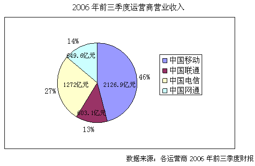 近日,四大運(yùn)營商紛紛公布2006年前三季度的財(cái)務(wù)報(bào)表,截止9月底中國移動(dòng)營運(yùn)收入達(dá)到2126.91億元,比上年同期增長20.8%,遠(yuǎn)遠(yuǎn)高于競爭對手中國聯(lián)通的營業(yè)收入增長5.6%,而固網(wǎng)運(yùn)營商中國電信和中國網(wǎng)通的收入增長更低,僅為4.5%和2.03%。透過這些數(shù)字,我們看到的是運(yùn)營商實(shí)力差距的進(jìn)一步拉大。