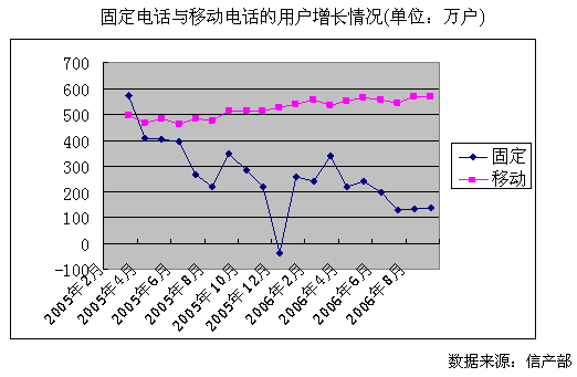 可見,中國移動(dòng)的營業(yè)收入已接近其他三大運(yùn)營商收入總和,如果按這個(gè)速度發(fā)展下去,中國移動(dòng)將很快獲得電信業(yè)的半壁天下,甚至形成1大于3的局面,這對固網(wǎng)運(yùn)營商來說并不是一個(gè)好消息,因?yàn)橐苿?dòng)通信的迅速發(fā)展,意味著固定通信被替代的趨勢愈加明顯。無論是從增量收入份額來看,還是從新增用戶份額來看,移動(dòng)通信與固定通信都呈“剪刀叉”式發(fā)展,兩者的差距迅速拉大,且自今年以來這個(gè)差距的在加速擴(kuò)大。