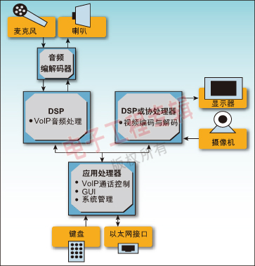 看看第一代可視電話所采用的架構(gòu),我們可以發(fā)現(xiàn)采用了不同的處理器分別用于語(yǔ)音、視頻和系統(tǒng)控制功能。因?yàn)樘幚硇枰,一般采用針?duì)密集媒體處理運(yùn)算(數(shù)字信號(hào)處理或DSP)優(yōu)化的處理器。例如:一個(gè)DSP用來(lái)處理語(yǔ)音處理功能,包括語(yǔ)音編碼/解碼、音調(diào)發(fā)生和檢測(cè)、回聲消除以及噪聲消減;一個(gè)DSP或?qū)S脜f(xié)處理器來(lái)處理視頻編碼和解碼;一個(gè)應(yīng)用處理器管理VoIP通話控制協(xié)議以及用戶界面(見(jiàn)圖1)。這種方式需要多個(gè)編程模型和開(kāi)發(fā)工具鏈,這反過(guò)來(lái)會(huì)導(dǎo)致需要更大的開(kāi)發(fā)團(tuán)隊(duì),增加培訓(xùn)和額外的成本。