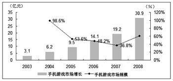 國(guó)內(nèi)手機(jī)游戲市場(chǎng)在過(guò)去的幾年里呈現(xiàn)快速發(fā)展的趨勢(shì)。2004年增長(zhǎng)率接近100%,2005年也有50%以上的增長(zhǎng)。但最近兩年國(guó)內(nèi)整個(gè)手機(jī)游戲市場(chǎng)隨著手機(jī)普及率的增速放緩也進(jìn)入了盤整期。iResearch咨詢估計(jì),從2005年至2007年,國(guó)內(nèi)手機(jī)游戲市場(chǎng)的收入規(guī)模盡管仍然處于上漲趨勢(shì),但年增長(zhǎng)率逐年下降,2008年后隨著市場(chǎng)環(huán)境更加成熟理性,年增長(zhǎng)率將會(huì)出現(xiàn)反彈,升至60%以上。