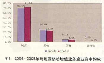 電信增值市場(chǎng)的開(kāi)放和政策環(huán)境的優(yōu)化,也吸引了眾多的外資企業(yè)。電信增值服務(wù)的投資來(lái)源、經(jīng)營(yíng)主體、服務(wù)目標(biāo)、經(jīng)濟(jì)功能與基礎(chǔ)電信業(yè)務(wù)存在明顯差異,彼此間有競(jìng)爭(zhēng)關(guān)系,但更多的是補(bǔ)充、豐富的關(guān)系。目前,我國(guó)已放開(kāi)電信增值市場(chǎng)準(zhǔn)入,從2005年起,整個(gè)電信增值業(yè)務(wù)市場(chǎng)就呈現(xiàn)出持續(xù)快速發(fā)展的勢(shì)頭,民營(yíng)資本已經(jīng)發(fā)展成為電信增值業(yè)務(wù)領(lǐng)域的主力軍,其所占企業(yè)數(shù)量比例已超過(guò)70%(見(jiàn)圖1)。