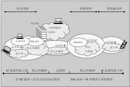 如圖3所示,與一個(gè)被訪問(wèn)的網(wǎng)不同,IP多媒體子系統(tǒng)還支持母網(wǎng)的概念。在這個(gè)例子中,母網(wǎng)是支持具有登錄權(quán)的IP多媒體子系統(tǒng)的核心網(wǎng)。被訪問(wèn)的網(wǎng)是當(dāng)前向用戶提供IP多媒體子系統(tǒng)服務(wù)連接的網(wǎng)。圖3中的運(yùn)營(yíng)商A擁有許多疊接網(wǎng)用戶的母網(wǎng),而運(yùn)營(yíng)商C擁有移動(dòng)電話的母網(wǎng),而用戶正在運(yùn)營(yíng)商D的網(wǎng)絡(luò)中漫游。