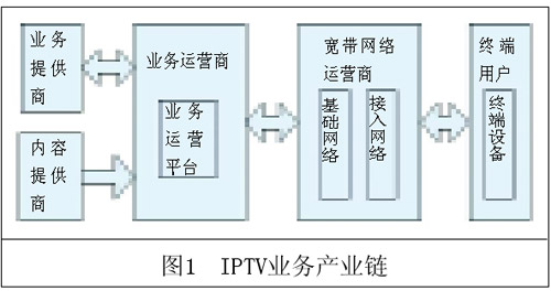 圖1所示的IPTV業(yè)務(wù)產(chǎn)業(yè)鏈中,主要角色包括內(nèi)容提供商/業(yè)務(wù)提供商(CP/SP)、業(yè)務(wù)運營商、網(wǎng)絡(luò)運營商和終端用戶。業(yè)務(wù)運營商具有IPTV業(yè)務(wù)運營資質(zhì),通過業(yè)務(wù)運營平臺保證業(yè)務(wù)的提供和管理運營,起著業(yè)務(wù)主導(dǎo)的作用;內(nèi)容提供商為業(yè)務(wù)運營商提供內(nèi)容,業(yè)務(wù)提供商向業(yè)務(wù)運營商提供增值業(yè)務(wù),使得業(yè)務(wù)中的內(nèi)容和種類豐富多彩以滿足用戶的不同需求,內(nèi)容提供商和業(yè)務(wù)提供商一般能根據(jù)用戶的使用情況獲取收入分成;