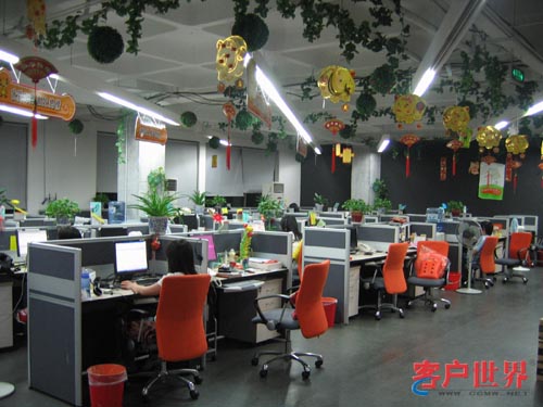 整個(gè)服務(wù)現(xiàn)場的裝修以桔黃色為主色調(diào),代表溫暖、和諧;格局不規(guī)則化,盡顯現(xiàn)代時(shí)尚的風(fēng)格;辦公室到處是綠色植物,墻上貼滿了各種相片、海報(bào)和宣傳語,天花板掛滿了激勵(lì)口號(hào)板;別具特色的洗手間文化;乒乓球室、休息室、休閑吧,咖啡機(jī)、茶葉、果汁、雪糕、飲料,魚缸、大液晶電視、音響……一點(diǎn)感覺不到這是一個(gè)枯燥的呼叫中心的工作環(huán)境。