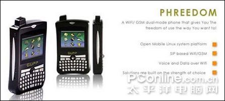 GUPP公司PHREEDOM手機(jī)基于VoWifi/GSM雙模的手機(jī)可以讓用戶自由選擇網(wǎng)絡(luò)。除了正常的GSM網(wǎng)絡(luò)之外,在有WiFi覆蓋的地方,用戶便可以使用WiFi網(wǎng)絡(luò)進(jìn)行通話,從而節(jié)約話費。在WiFi環(huán)境中,它還也可以進(jìn)行網(wǎng)頁瀏覽、郵件收發(fā)、數(shù)據(jù)下載等操作。
