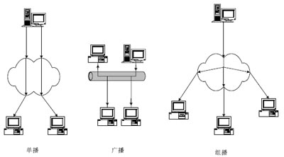 目前此類業(yè)務(wù)在IP網(wǎng)上幾乎都是采用IP組播的方式來實現(xiàn)的。IP網(wǎng)通信包括三種通信方式(如圖1所示):單播(Unicast)、廣播(Broadcast)和組播(Multicast)。單播是指源主機向指定單個目標主機發(fā)送數(shù)據(jù)信息,單播連接是一一對應(yīng)的,即一個發(fā)送者只能對應(yīng)一個接收者;廣播指源主機向一個網(wǎng)絡(luò)段中的所有主機發(fā)送數(shù)據(jù)信息,即該網(wǎng)段所有主機都可以接收這個數(shù)據(jù)信息;組播介于單播、廣播之間,源主機向網(wǎng)絡(luò)中特定的一組主機發(fā)送數(shù)據(jù)信息,這些主機是靠組播地址來指定的。