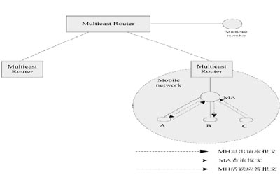 IETF的移動IP協(xié)議定義了家鄉(xiāng)代理(home Agent,簡稱HA)、外地鏈路、外地代理(foreign Agent,簡稱FA)、通信對端等概念,一個移動節(jié)點擁有兩個IP地址:家鄉(xiāng)地址和轉(zhuǎn)交地址。節(jié)點在移動過程中,家鄉(xiāng)地址不改變,發(fā)送到該節(jié)點的數(shù)據(jù)都通過家鄉(xiāng)地址與轉(zhuǎn)交地址之間的隧道轉(zhuǎn)發(fā)給移動節(jié)點。當組成員切換時,包括網(wǎng)絡(luò)鏈路間切換的固有時延,以及重新加入組播組以及建立組播轉(zhuǎn)發(fā)樹的時延,都將導(dǎo)致組播成員丟包。