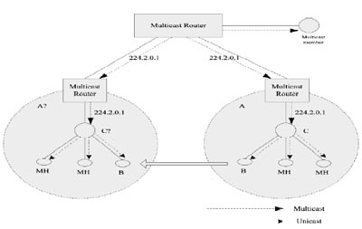 host,簡稱MH)在一個子網(wǎng)中,如果要加入某個組播組,就向當?shù)刈泳W(wǎng)的MA發(fā)送一個加入請求,在MA向組播路由器發(fā)送加入組播組的請求后,通過組播路由協(xié)議建立到該MA的組播樹。