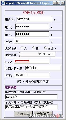單擊首頁(yè)中的“用戶注冊(cè)”,然后在彈出的用戶注冊(cè)頁(yè)面中輸入用戶名、密碼、性別等信息(如圖24所示),單擊“開(kāi)始注冊(cè)”即告完成。