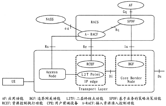 RACS是NGN的組成部分之一,將業(yè)務(wù)層的資源需求與網(wǎng)絡(luò)承載層的資源分配相關(guān)聯(lián),主要完成策略控制、資源預(yù)留、接納控制、網(wǎng)絡(luò)地址轉(zhuǎn)換(NAT)和防火墻穿越等功能。RACS通過一系列策略為應(yīng)用提供基于傳輸?shù)目刂品⻊?wù),只要該應(yīng)用支持RACS接口,RACS就能保證任意應(yīng)用能夠請(qǐng)求到與其服務(wù)相匹配的傳輸資源。同時(shí),RACS為運(yùn)營(yíng)商提供多種不同接納控制的方法,并設(shè)置各自的承載服務(wù)策略。RACS為各種服務(wù)提供獲得網(wǎng)絡(luò)資源的方法,使得用戶終端可以獲得所提供服務(wù),其總體功能結(jié)構(gòu)如圖3所示[5]。