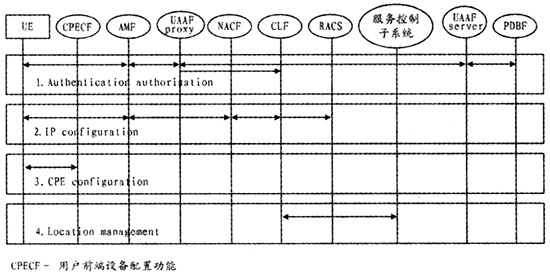 AMF負(fù)責(zé)翻譯UE的接入請(qǐng)求,將UE的IP地址分配請(qǐng)求以及網(wǎng)絡(luò)配置參數(shù)請(qǐng)求轉(zhuǎn)發(fā)至NACF,將用戶鑒權(quán)請(qǐng)求轉(zhuǎn)發(fā)給用戶接入鑒權(quán)功能(UAAF),反向則將來(lái)自NACF或UAAF的響應(yīng)轉(zhuǎn)發(fā)給UE。