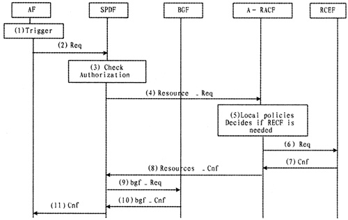 當(dāng)收到來(lái)自SPDF的資源請(qǐng)求后,A-RACF便按照其事先從NASS收到的用戶接入清單進(jìn)行鑒別。如果A-RACF核對(duì)從SPDF收到的QoS請(qǐng)求信息可以提供,即接受該請(qǐng)求,并且A-RACF在RCEF中加載該傳輸策略。RCEF實(shí)施A-RACF傳送過來(lái)的二層/三層媒體流策略,完成門控、QoS標(biāo)記、帶寬限制等功能。如圖6即為AF請(qǐng)求資源時(shí)的具體消息流[7]。