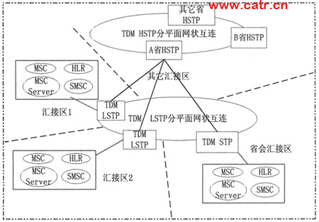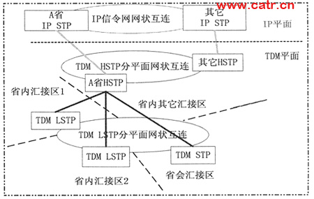按照混合方式的網絡組織如下:作為TDM信令網的補充,IP STP和TDM STP共同承擔省會匯接區(qū)的業(yè)務。IP