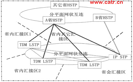 IP STP兼做L/HSTP。IP STP同時與B省HSTP開通B鏈路。省會匯接區(qū)到B省的省際長途業(yè)務直接通過IP