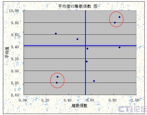 利用散點圖很容易找出我們的內(nèi)部標竿,例如下面這張圖是每個班組小休率在12月份的平均值和離散系數(shù),可以清楚的看到,這四個象線的左下角,有兩個班組的小休率的平均值低于9以下,有一個班組甚至在8.8左右,這兩個班組不只是平均值最低,而且在12月份每一天的小休率也是控管的最好,差異是最小的。