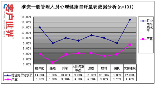 目前,員工壓力和心理健康情況已成為困擾整個(gè)行業(yè)的主要問題之一,我們通過專業(yè)方法對(duì)淮安中心的員工心理健康和壓力狀況進(jìn)行了科學(xué)的測(cè)量,以了解該中心員工的壓力和心理健康狀況,具體測(cè)量數(shù)據(jù)如下: