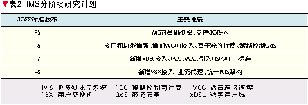 3GPP依照UMTS 3G移動(dòng)通信系統(tǒng)的系列標(biāo)準(zhǔn)版本定義了IMS的分階段演進(jìn)計(jì)劃[5],如表2所示。其中,2002年完成的R5是第一個(gè)全I(xiàn)P移動(dòng)網(wǎng)絡(luò)標(biāo)準(zhǔn),它將核心網(wǎng)歸為一個(gè)統(tǒng)一的基于IP的分組(PS)域,具有服務(wù)質(zhì)量(QoS)保證,能夠提供各種類型的多媒體增值業(yè)務(wù),其核心技術(shù)標(biāo)準(zhǔn)就是IMS。R6進(jìn)一步完善IMS接口和功能,增加對(duì)于WLAN的接入支持,并研究IMS域的計(jì)費(fèi)和QoS控制技術(shù)。R7融合TISPAN關(guān)于NGN的研究標(biāo)準(zhǔn),增加對(duì)于xDSL接入技術(shù)的支持,提出策略控制與計(jì)費(fèi)(PCC)技術(shù)以及WLAN/3G語音連續(xù)通信的話音連接連續(xù)(VCC)技術(shù)。正在研究中的R8將協(xié)同各個(gè)標(biāo)準(zhǔn)化組織的工作,研究支持組合業(yè)務(wù)的業(yè)務(wù)代理技術(shù)以及下一步的統(tǒng)一IMS架構(gòu)。