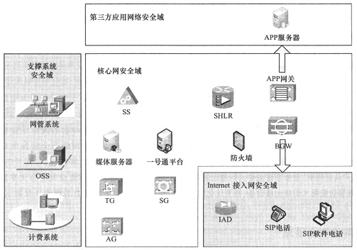 核心網(wǎng)安全域包括所有的軟交換機,TG、AG、SG等接入網(wǎng)關,BGW類設備,關鍵業(yè)務平臺(包括SHLR、號碼轉換平臺等),軟交換媒體服務器和應用服務器,開發(fā)給第三方業(yè)務接口的應用網(wǎng)關。Internet接入網(wǎng)安全域包括所有分配公網(wǎng)地址的SIP電話終端、IAD類設備、各類SIP接入的PC等。支撐系統(tǒng)安全域包括網(wǎng)管、計費和OSS等輔助運營系統(tǒng)。第三方應用網(wǎng)絡安全域主要包括所有以開發(fā)業(yè)務接口方式接入的應用服務器,鑒于目前實際應用中很少涉及到這種應用,這里不討論該區(qū)域的安全需求。