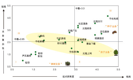 根據(jù)“業(yè)務(wù)復(fù)雜性—技術(shù)困難度”模型,可以清晰地看到一個(gè)業(yè)務(wù)的成功商用和業(yè)務(wù)復(fù)雜性與技術(shù)困難度密切相關(guān),如短信和彩鈴等復(fù)雜性與技術(shù)困難度都很低的業(yè)務(wù)是比較容易成功商用的,將這一類業(yè)務(wù)歸類為“果樹業(yè)務(wù)”,在第一象限(象限I)。還有一些業(yè)務(wù)如即時(shí)通信、整曲下載和無(wú)線搜索等業(yè)務(wù),已經(jīng)開始快速增長(zhǎng)但是其用戶規(guī)模和收入量都還低于“果樹業(yè)務(wù)”,在業(yè)務(wù)復(fù)雜性與技術(shù)困難度坐標(biāo)中這類業(yè)務(wù)處于4個(gè)象限交匯的中部區(qū)域(即圖中黃色區(qū)域),由于業(yè)務(wù)復(fù)雜性和技術(shù)困難度都會(huì)隨時(shí)間而減小,從而這一區(qū)域的業(yè)務(wù)會(huì)向第一象限演進(jìn),這類業(yè)務(wù)稱為“苗子業(yè)務(wù)”,即在3年內(nèi)能夠成熟的業(yè)務(wù)。在坐標(biāo)系的右上角第四象限,即業(yè)務(wù)復(fù)雜性和技術(shù)困難度均較高的業(yè)務(wù),稱之為“種子業(yè)務(wù)”,這類業(yè)務(wù)在短期內(nèi)很難快速成長(zhǎng)。