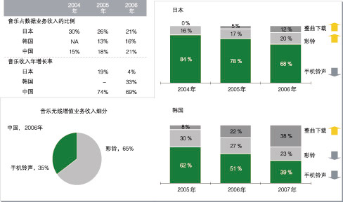 圖3 無(wú)線音樂(lè)業(yè)務(wù)在日本、韓國(guó)和中國(guó)的發(fā)展情況