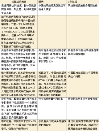 無(wú)線音樂(lè)市場(chǎng)的現(xiàn)狀、3年以后的情況以及成功的關(guān)鍵因素歸納總結(jié)見表2。