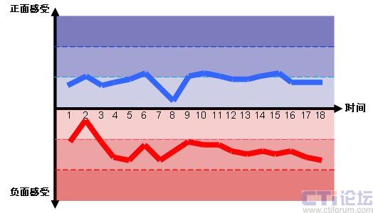 圖2的情感曲線分別是中國移動(dòng)的“喜愛”情感曲線和中國電信的“討厭”情感曲線,對應(yīng)于雙方整個(gè)呼入電話體驗(yàn)18個(gè)子流程上的情感感受。(注意,我們只列出了中國移動(dòng)的“喜愛”曲線和中國電信的“討厭”曲線來舉例說明。)