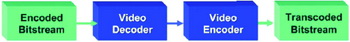 視頻轉(zhuǎn)碼是一個高運算負荷的過程,需要對輸入的視頻流進行全解碼、視頻過濾/圖像處理、并且對輸出格式進行全編碼。最簡單的轉(zhuǎn)碼過程(圖3)僅僅涉及到解碼一個比特流和用不同的編解碼器重新編碼兩個步驟。這種硬轉(zhuǎn)碼看似很簡單,只需要一個解碼器和一個編碼器,但是最終顯示結(jié)果并不理想,因為視頻數(shù)據(jù)解碼后重新編碼會降低畫質(zhì)。