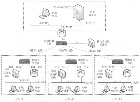 同樣以移動網(wǎng)為例,例子中移動交換機到維護終端支持TCP/IP方式,分公司具有本地維護終端和網(wǎng)管終端兩種類型的維護臺。本地維護終端通過以太交換機直接與移動交換機相連;網(wǎng)元和網(wǎng)管終端通過以太網(wǎng)接入邊緣路由器,經(jīng)路由器接.el轉(zhuǎn)化以El方式接入到時隙抽取設備中,由于傳送網(wǎng)管信息占用帶寬較小,
