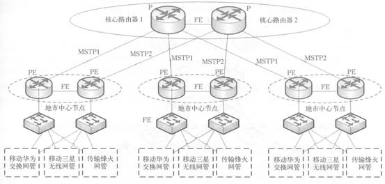 省中心核心節(jié)點配置兩臺高端路由器作為承載網(wǎng)的核心P路由器,同時配置兩臺高性能三層交換機作為PE設備,對省中心的各網(wǎng)管核心服務器進行接入。