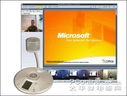 微軟Office RoundTable,音頻-視頻協(xié)作設(shè)備,帶有一個獨特的 360 度相機。在結(jié)合 Office Communications Server 2007 使用時,RoundTable 還可交付卓越的會議體驗:將會議環(huán)境擴展到多個位置,F(xiàn)場及遠(yuǎn)程位置的與會人員可以全景查看會議室中的每位成員,還可以在輪流發(fā)言時拉近特寫某個與會者。