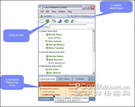 Sametime Advanced的即時共享功能使用戶能夠啟動屏幕或應(yīng)用分享會話,并支持其他參與者“驅(qū)動”并修改文檔。此外,用戶還能夠事先安排同事的位置,突出顯示用戶位置和離線聯(lián)系人上次出現(xiàn)的位置,節(jié)約時間和精力。