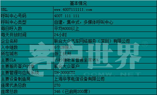 2007年秋天,聯(lián)合大眾汽車網(wǎng)絡(luò)服務(wù)(深圳)有限公司現(xiàn)代化、智能化的大型全國(guó)電話呼叫中心落成并投入使用。從投入使用至今,呼叫中心經(jīng)歷了從無到有、不完善到健全的發(fā)展歷程,聯(lián)合大眾24小時(shí)全國(guó)服務(wù)熱線現(xiàn)已成為客戶價(jià)值與公司價(jià)值之間傳遞的橋梁。