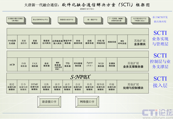 案例:我與大唐中聯(lián)(大唐融合)、和創(chuàng)世紀(jì)、華夏成訊等公司的技術(shù)開(kāi)發(fā)人員經(jīng)過(guò)幾年來(lái)的摸索與實(shí)踐開(kāi)發(fā),提出軟件化融合通信解決方案(SCTI)。通過(guò)計(jì)算機(jī)的軟件(通信服務(wù)系統(tǒng))來(lái)實(shí)現(xiàn)交換機(jī)上的所有通信功能,在互聯(lián)網(wǎng)上實(shí)現(xiàn)所有傳統(tǒng)通信網(wǎng)上的所有功能、還實(shí)現(xiàn)互聯(lián)網(wǎng)上的新的通信功能,在與傳統(tǒng)通信網(wǎng)上相連,只需增加一塊語(yǔ)音接口卡,就能實(shí)現(xiàn)互聯(lián)網(wǎng)與傳統(tǒng)通信的統(tǒng)一。此方案的成本比統(tǒng)一通信、融合通信等解決方案的成本要降幾十倍到上百倍。