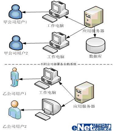 傳統(tǒng)軟件是在公司內(nèi)部架設(shè)軟件運行環(huán)境,自己購買應(yīng)用服務(wù)器、數(shù)據(jù)庫服務(wù)器、網(wǎng)卡等硬件,安裝自己的局域網(wǎng)并在局域網(wǎng)內(nèi)部署軟件。所以不同公司都各自部署一套自己的系統(tǒng)。不同公司的用戶事實是通過不同的途徑訪問不同的系統(tǒng),如圖2所示: