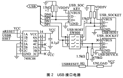 在ARM9開發(fā)板內(nèi)部含有1個(gè)USB2.O接口控制器,接口電路如圖2所示。共有3個(gè)LISB接口(2個(gè)Host和1個(gè)Device),通過選擇開關(guān)SW800進(jìn)行選通控制。74HC08作為4個(gè)二輸入與門邏輯電路,負(fù)責(zé)控制信號(hào)的邏輯組合。該接口用來連接USB接口的外部設(shè)備。