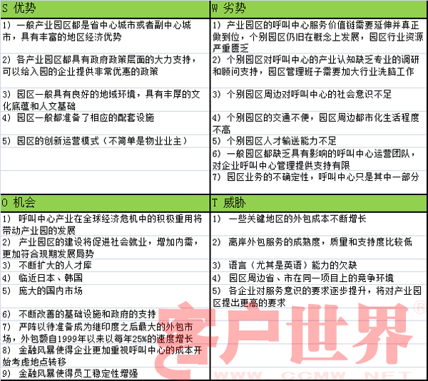 筆者在此更愿意用SWOT分析的模式來(lái)闡述中國(guó)呼叫中心產(chǎn)業(yè)園區(qū)的特點(diǎn):