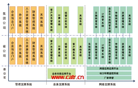從系統(tǒng)部署來看,目前各大運營企業(yè)都以集團與省公司為主要的建設(shè)與管理維護單位,建成了集團與省兩級模式的支撐系統(tǒng)。集團公司的系統(tǒng)主要提供面向全公司的企業(yè)管理、經(jīng)營分析等功能;省公司從職能管理單位逐步轉(zhuǎn)向了兼顧管理、生產(chǎn)的單位,具有了越來越多的生產(chǎn)職能,在運營支撐系統(tǒng)建設(shè)中的作用較為突出,一般情況下,在遵循集團公司的總體指導(dǎo)思想下,可自行規(guī)劃與建設(shè)本省的支撐系統(tǒng);市公司的生產(chǎn)職能有所削弱,主要負責(zé)市場營銷、客戶支撐以及設(shè)備的現(xiàn)場維護等工作,因而主要是支撐系統(tǒng)的使用單位。