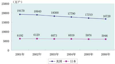 關(guān)于固定電話受沖擊的現(xiàn)象,美國比日本更加突出,這是因為美國大的通信公司除了提供電話、電視和高速上網(wǎng)捆綁服務(wù)外,基本上不提供IP電話(普通電話機經(jīng)本地市話交換機以及網(wǎng)關(guān)進入因特網(wǎng))和VoIP電話(普通電話機經(jīng)電話連接器進入因特網(wǎng))。美國衛(wèi)生統(tǒng)計中心公布的數(shù)據(jù)顯示,2007年下半年,美國只有移動電話而沒有固定電話的家庭比例達到15.8%,這一比例在2004年同期只有6.1%,大約2%的美國家庭沒有電話。