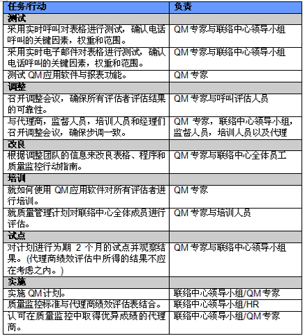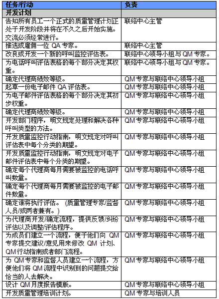 4. 開展項(xiàng)目交流。管理人員必須就新的或者修繕后的QM計(jì)劃與代理商進(jìn)行交流。QM的成功與否與代理商的合作密不可分,如果代理商受邀參與新QM計(jì)劃的開發(fā)并且所有改變都在雙方之間明確交流過,那么成功的機(jī)會(huì)也將大大提高。交流的內(nèi)容應(yīng)包括為什么要開發(fā)這樣一個(gè)計(jì)劃,它的作用和職責(zé)是什么,它對(duì)代理商會(huì)產(chǎn)生哪些影響(對(duì)于他們的評(píng)估和提升)以及它能帶來哪些好處。幫助代理商認(rèn)識(shí)到QM計(jì)劃積極的一面很重要,因?yàn)橹挥羞@樣才能讓他們看到QM不僅僅是管理人員用來告訴他們做錯(cuò)了事情的一種手段。讓聯(lián)絡(luò)中心全體員工參與QM計(jì)劃的開發(fā)能夠建立他們對(duì)該計(jì)劃的支持,提高接受度的同時(shí)避免不知所措。這對(duì)聯(lián)絡(luò)中心剛剛嶄露頭角,QM計(jì)劃還未全面鋪開的中國市場而言尤為重要。