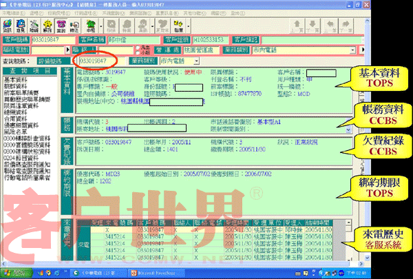 我們推動(dòng)「CPEP客服流程提升計(jì)劃」的重點(diǎn)是在IVR流程中就請(qǐng)客戶自行輸入其欲查詢或辦理的電話號(hào)碼,同時(shí)客服系統(tǒng)便先透過(guò)EAI到后端信息系統(tǒng),查詢出該號(hào)碼的核心數(shù)據(jù)(含基本、帳務(wù)、欠費(fèi)記錄、來(lái)電歷史等),當(dāng)客服人員應(yīng)答時(shí)客服系統(tǒng)便立即將這些核心數(shù)據(jù)顯示在屏幕上(如圖一),客服人員便可立即掌握此客戶之相關(guān)資料,CPEP如此改善后平均的服務(wù)效率提升了11%。