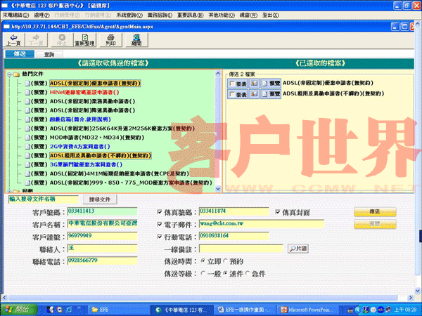 EFE第一步先將所有的窗口、文件與數(shù)據(jù)轉(zhuǎn)為電子化的檔案,當(dāng)需要傳送書面文件給客戶時(shí),客服人員可立即在在線點(diǎn)選以傳真或電子郵件將文件傳給客戶(如圖二),傳送成功后并立即以SMS通知客戶。當(dāng)客戶反饋數(shù)據(jù)回來(lái)時(shí),EFE會(huì)自動(dòng)接收并存盤,接收成功后EFE則會(huì)立即發(fā)送SMS訊息給客戶安心,而且所有送出與接收文件都有完整記錄可共管理、追蹤與處理。